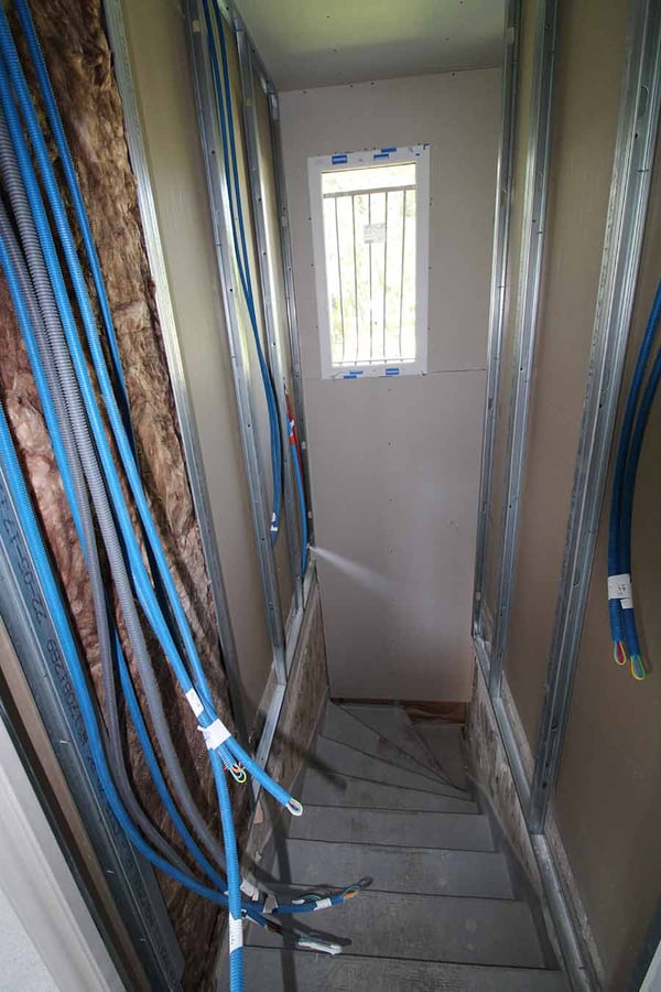 Le plaquiste a commencé par ferrailler ces plafonds qui ont été isolés par la suite par une projection de ouate de cellulose. Il a ensuite ferraillé et isolé les doublages avec une isolation laine de verre de 120 mm d’épaisseur. Le plombier et l’électricien sont intervenus pour tirer tout le lot technique par-dessus la laine, ensuite le plaquiste a pu plaquer ces plafonds, doublages et a pu commencer à bâtir les cloisons de distribution de type placostyl (rail montant laine de verre de 45 mm).