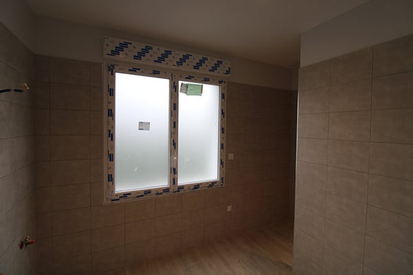 Ensuite, le menuisier est venu poser les différentes menuiseries (fenêtre, châssis fixe, porte-fenêtre, porte d’entrée, …) en PVC blanc RAL 9016 avec volet roulant intégré avec lame aluminium blanc. Certaines menuiseries sont équipées de l’option oscillot battant. Seul le coulissant qui a servi à remplacer la porte de garage est en aluminium. Toutes les menuiseries sont équipées d’un vitrage 4/20/4 avec option Warm Edge pour un complément d’isolation thermique. Seul le vitrage de la salle de bains est opaque.
