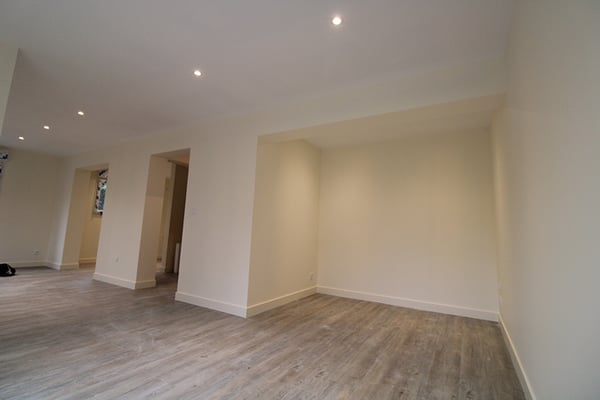 Il s’est également occupé des sols : sur tout le rez-de-chaussée, buanderie, WC, salle de bain, couloir, il a posé un sol LVT clipsable imitation parquet, avant de poser un sol LVT. Pour ce dernier, il a fallu un minimum de préparation, il a donc coulé un ragréage. Dans les pièces à vivre, suite à la démolition de plusieurs murs porteurs, il y a eu des problèmes de niveau, avec plus de 4 cm de différence il a donc fallu prévoir un ravoirage avant de pouvoir passer la dernière couche de ragréage, pour pouvoir poser le LVT sur un support sain. Le plâtrier a posé un parquet stratifié 4 champs frein dans les chambres.